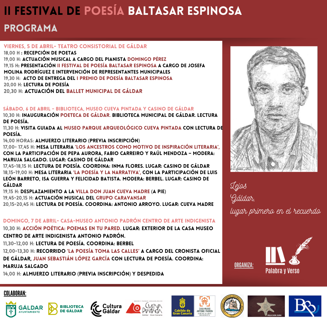 12 marzo, 202412 marzo, 2024Palabra y Verso Programa del II Festival de Poesía Baltasar Espinosa Tendrá lugar los días 5, 6 y 7 de abril en Gáldar, Gran Canaria Comparte palabrayverso.com Haz clic para compartir en X (Se abre en una ventana nueva) X Haz clic para compartir en Facebook (Se abre en una ventana nueva) Facebook Haz clic para imprimir (Se abre en una ventana nueva) Imprimir Haz clic para compartir en WhatsApp (Se abre en una ventana nueva) WhatsApp Me gusta Cargando...