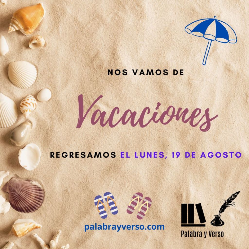 5 agosto, 20245 julio, 2024Palabra y Verso NOS VAMOS DE VACACIONES del 5 al 18 de agosto Nos volveremos a encontrar el lunes, 19 de agosto. ¡Que pasen unos felices días de lectura y descanso! Comparte palabrayverso.com Haz clic para compartir en X (Se abre en una ventana nueva) X Haz clic para compartir en Facebook (Se abre en una ventana nueva) Facebook Haz clic para imprimir (Se abre en una ventana nueva) Imprimir Haz clic para compartir en WhatsApp (Se abre en una ventana nueva) WhatsApp Me gusta Cargando...