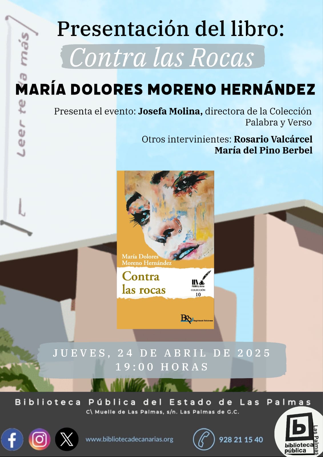La presentación de ‘Contra las rocas’ tendrá lugar el jueves, 24 de abril, a las 19,00 horas en la sede de la Biblioteca Pública del Estado de Las Palmas de Gran Canaria, C/Muelle de Las Palmas, junto al parque San Telmo.