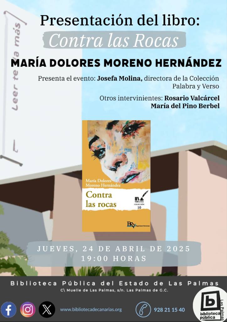 La Biblioteca Pública del Estado de Las Palmas de Gran Canaria acogerá este jueves, 24 de abril, la presentación de ‘Contra las rocas’, primer poemario en solitario de la autora grancanaria, María Dolores Moreno Hernández.