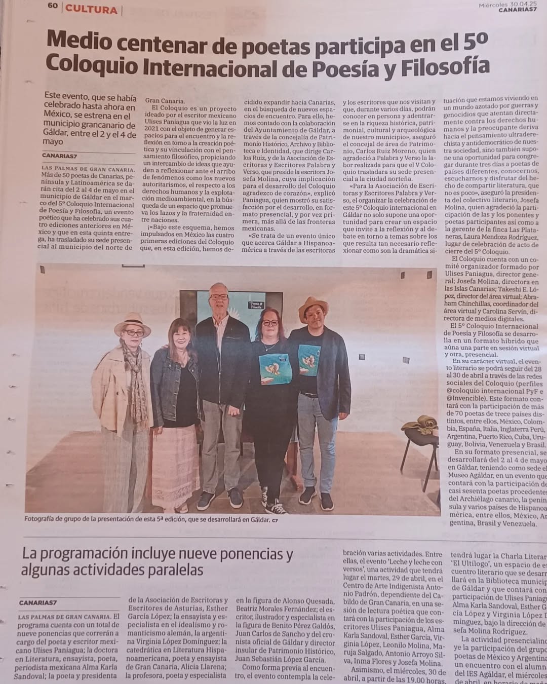 El V Coloquio Internacional de Poesía y Filosofía contó en esta edición con la colaboración de la Asociación de Escritoras y Escritores Palabra y Verso, para su celebración de carácter presencial los días 29 y 30 de abril, y 2, 3 y 4 de mayo en Gáldar, así como del Ayuntamiento de Gáldar, a través de la concejalía de Patrimonio Histórico, Archivo y Biblioteca; del Museo Agáldar y de la Biblioteca municipal de Gáldar.