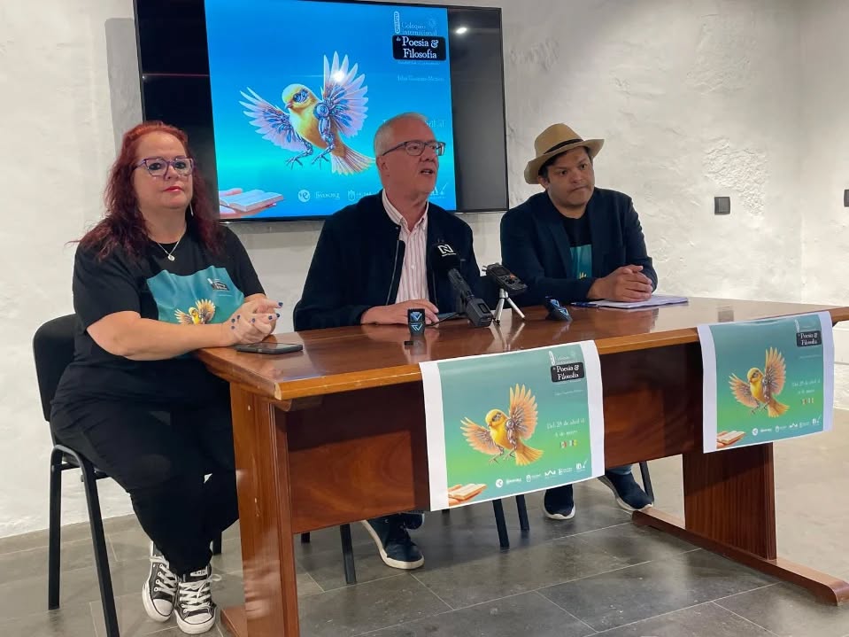 PRESENTACIÓN EN RUEDA DE PRENSA: la presidenta de Palabra y Verso y directora en Canarias del V Coloquio, Josefa Molina; el concejal de Patrimonio Histórico del Ayuntamiento de Gáldar, Carlos Ruiz y el director del V Coloquio, el poeta de México, Ulises Paniagua.
