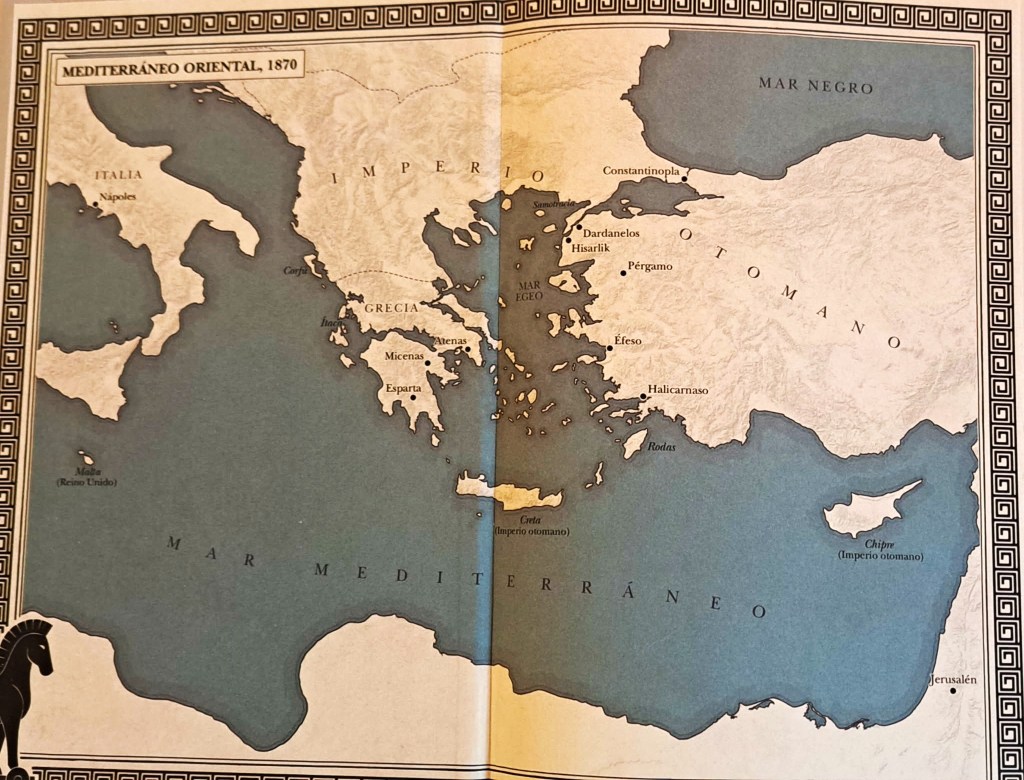 El tercer personaje es un funcionario inglés llamado Frank Calvert. Un arqueólogo aficionado, pero con un enorme respeto por esos vestigios. Tiene una villa en la zona de la búsqueda. Una figura fundamental en el hallazgo de la soñada ciudad, aunque la gloria se la llevó el alemán.